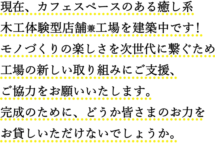 新工場では、木工製品に実際に見て触れて購入することができる直売店や、カフェスペースも併設する予定です。コーヒーや軽食を楽しみながら、和気あいあいとした雰囲気で『木工』に触れていただきたいです。