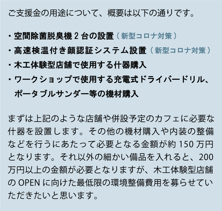カフェスペースがある木工体験型店舗で使用する什器、資材に充てます。また、ワークショップでは使用する機材(充電式ドライバードリル、ポータブルサンダー)の購入費用にも充当します。