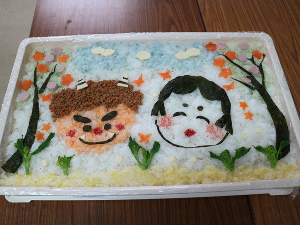 お寿司は恵方巻きの代わりに、かわいい節分の押し寿司が。大人からも子どもからも歓声が上がっていました。