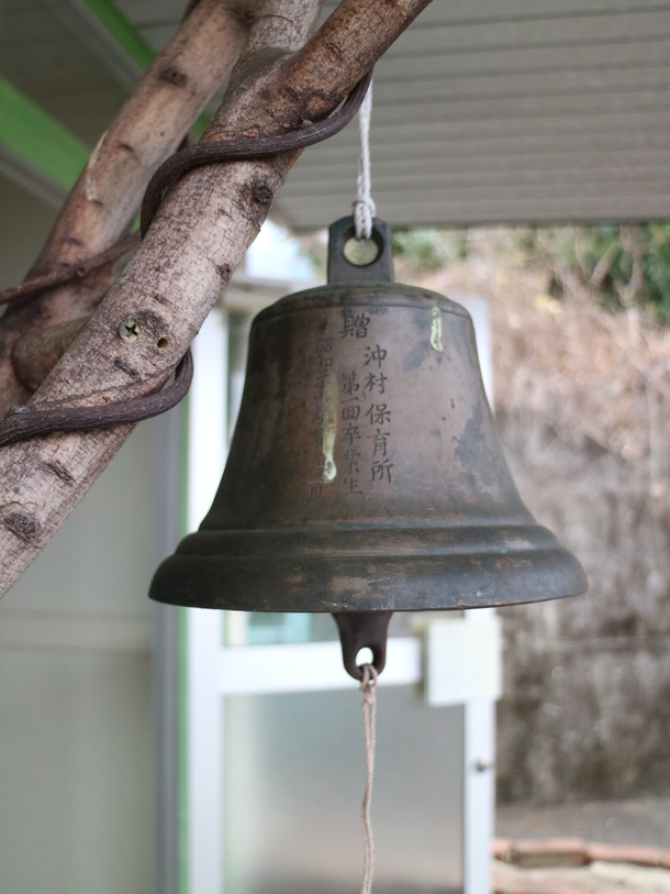 沖保育園の歴史は古く、今も園の玄関前に吊るされている鐘がそれを物語っており、第一回卒業生から送られた鐘に記された年号は「昭和29年」。