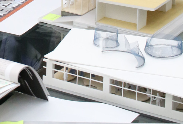 隈研吾研究室には、外国人の研究生もたくさんいらっしゃるそうで、和木小学校の図面の確認をされていらっしゃるこの方もそのお一人のようです。この様子を見ると、ワールドワイドなプロジェクトのように感じますね。