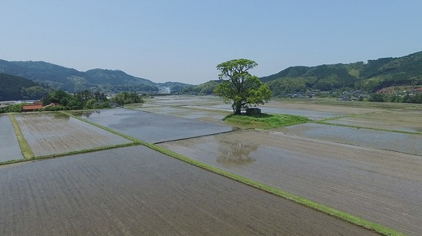 上空からゆっくり下降して、大きな楠と、広がる水田♪