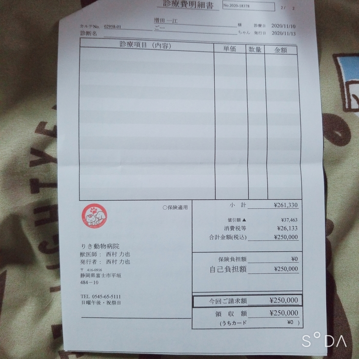 手術費¥250.000(手数料1.2%+税をひかれると、約22万円ほど受け取れます)