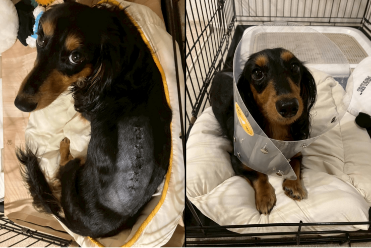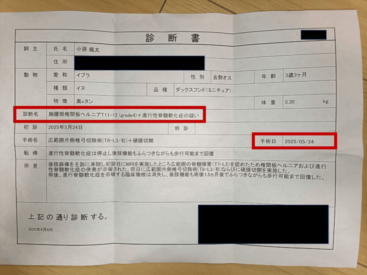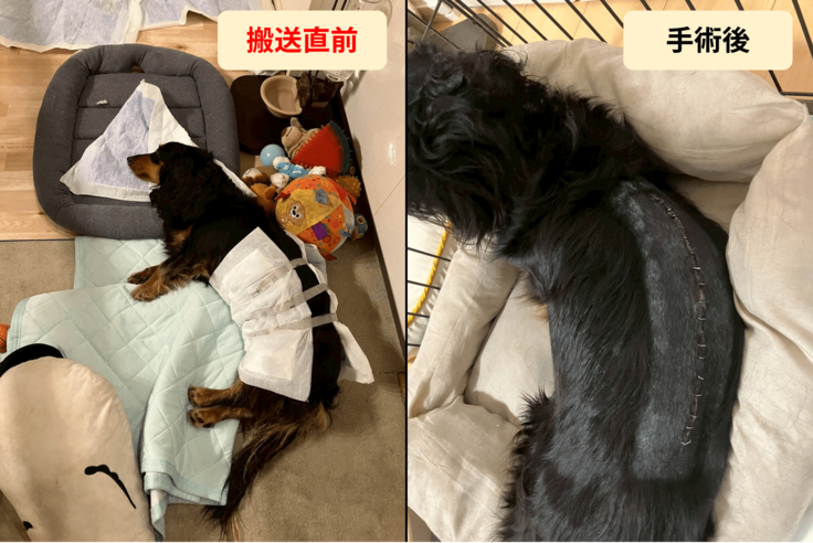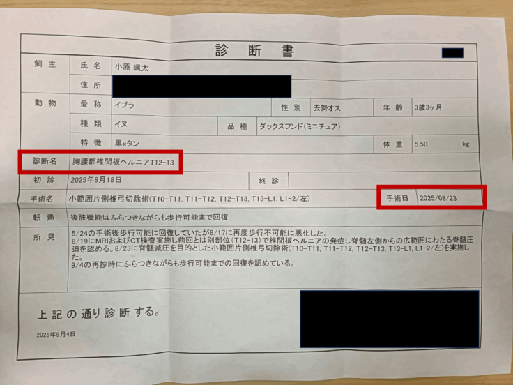 2025年5月、イブラは下半身不随で突然歩けなくなり、救急病院へ。診断は「進行性脊髄軟化症を伴う重度椎間板ヘルニア(グレード4-5)」で、即日で緊急手術を受けました。しかし3か月後に再発し、現在までに2度の大手術を経験。治療費はすでに約170万円となっています。