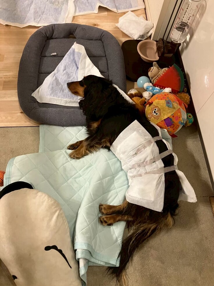 排泄も自力では難しく、急遽ペットシーツを敷いて対応。体を支えながら、排泄後にきれいに拭き、少しでも快適に過ごせるよう気を配りました。