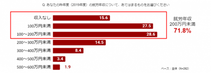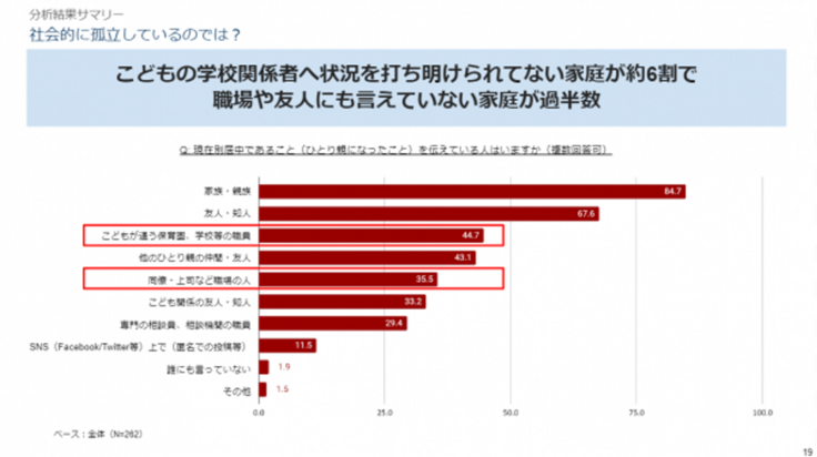 2020年9月に私たちが実施した別居中・離婚前のひとり親家庭262世帯への調査では、対象者のうち98%は母子家庭で、7割以上が相手からのDVを経験しており、かつ就労年収200万未満。過半数が行政等の専門機関、職場や友人に状況を打ち明けられていない状況がわかりました。