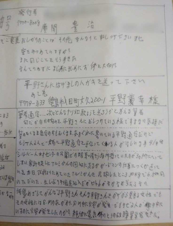 そして廣間さんはなんと、「平野通信」という便りを独自に発行されています。