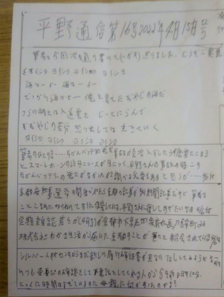 内容は、事件のことから、平野さんに縁のある京都の情報、ご自身の暮らしについて、そして支援の呼びかけなど、多岐に渡ります。