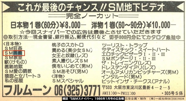 ・雑誌「S&Mスナイパー」1986年1月号に掲載されていた広告