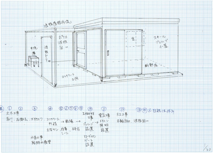 土木基礎工事(草刈り、石撤去)1日→水道工事(給排水管)1日→コンクリ打設1日→乾燥4日→エクステリア工事(プレハブ設置)1日→電気工事1日→波板囲い工事1日 約2週間を見込んでいます。