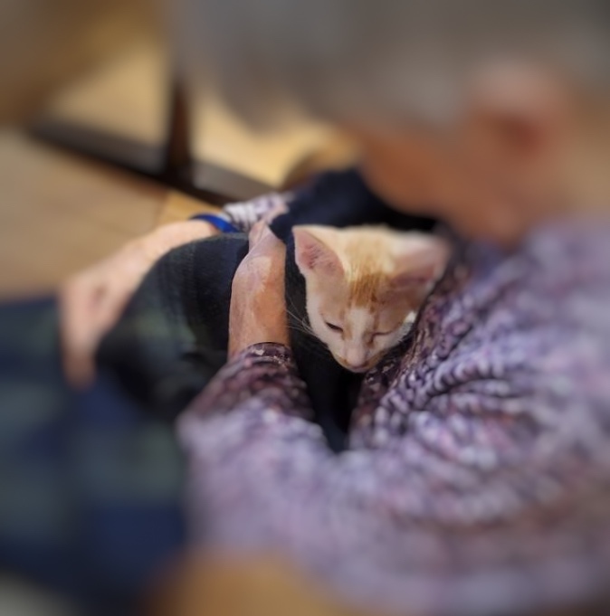 ホーム入居者の膝の上で、気持ち良さげにゴロゴロ喉を鳴らすシーンは、見てるこちらも幸せな気持ちになります。猫がリラックスしている時などに鳴らすゴロゴロ音は、人間の免疫力を高める効果や、鬱病の症状を改善させることもあるとか。