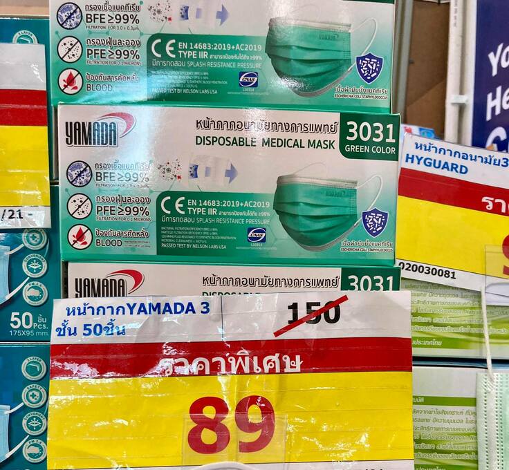 コロナ対策の必需品、マスクは50枚で89バーツ≒300円
