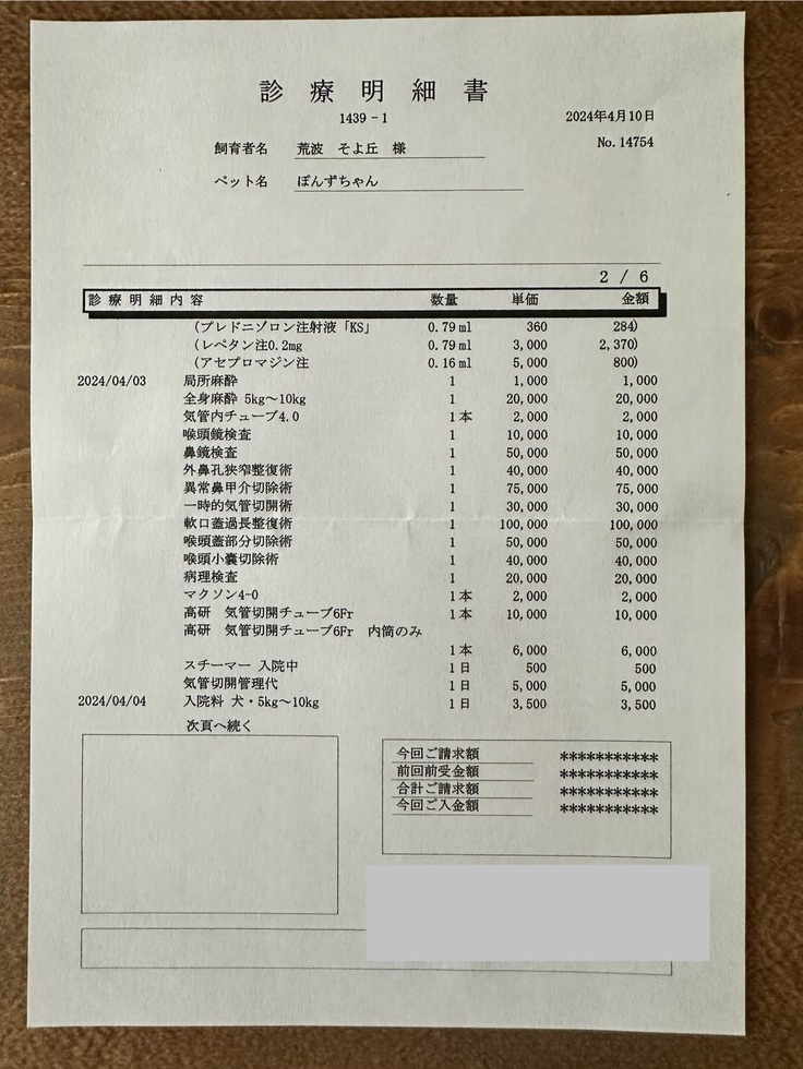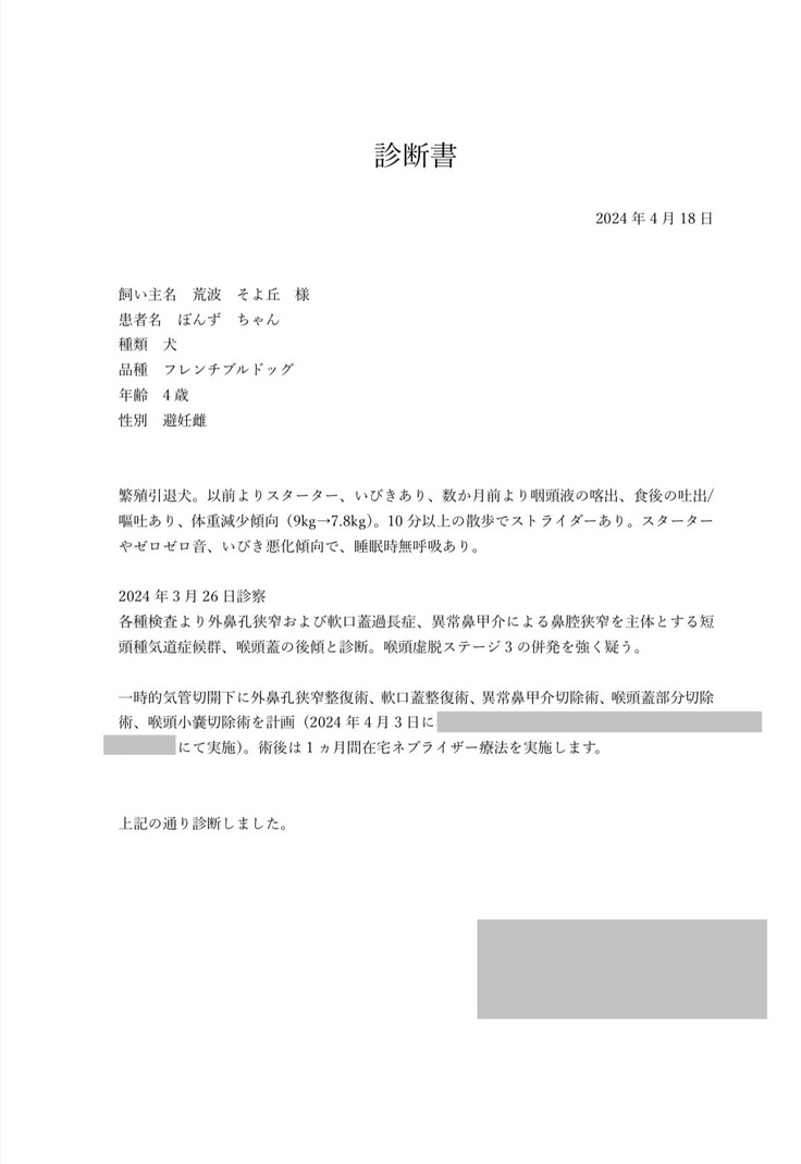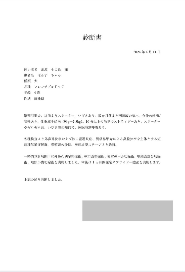 ・資金の使途 ぽんずの短頭種気道症候群の今回の手術に関する担当医の最初の診察代、手術代、