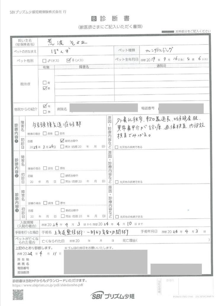 ①ペット保険による補償の有無:あり (SBIプリズムいきいき小短 譲渡犬専用ペット保険)