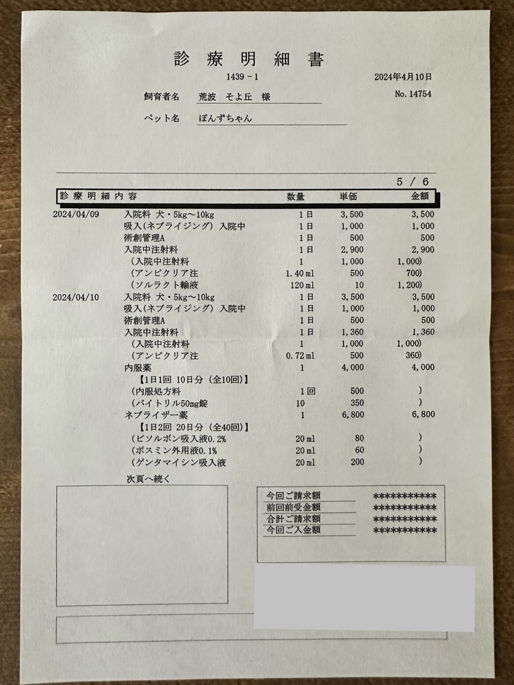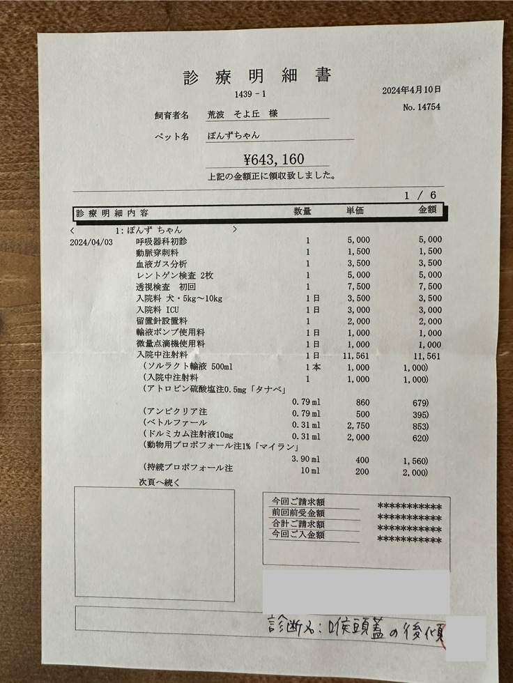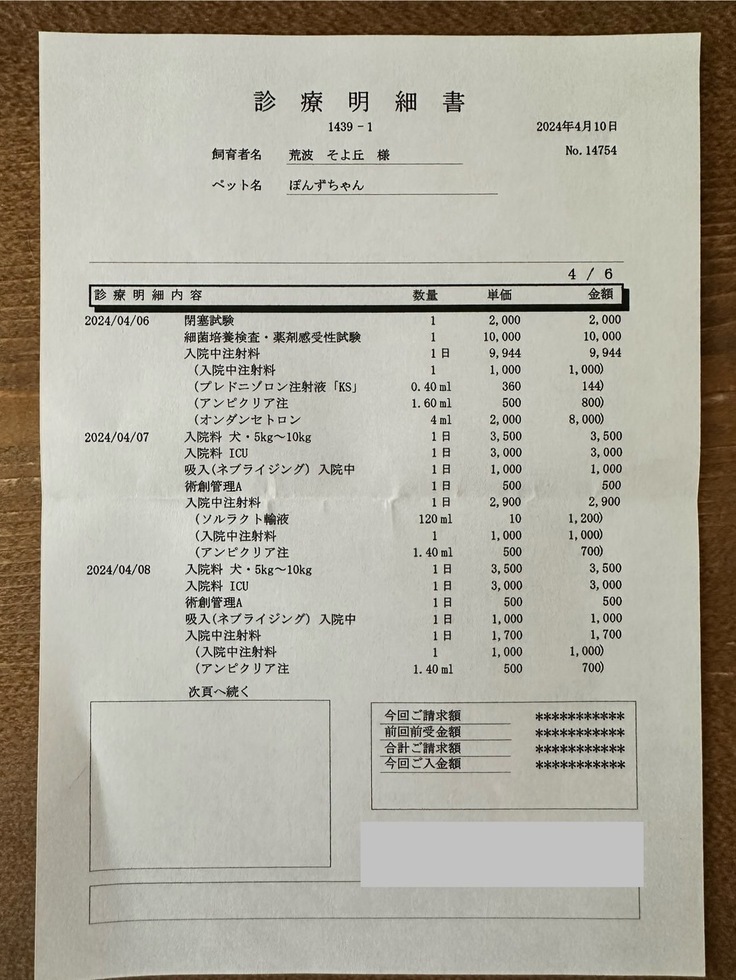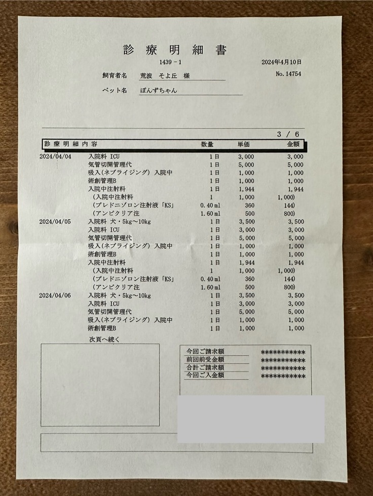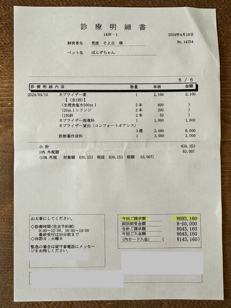 ・ 今回の手術・入院費用:693.160円-74.500円(50.000円手術費用+入院3.500円×7泊8日)(ペット保険による補填)=618.660円