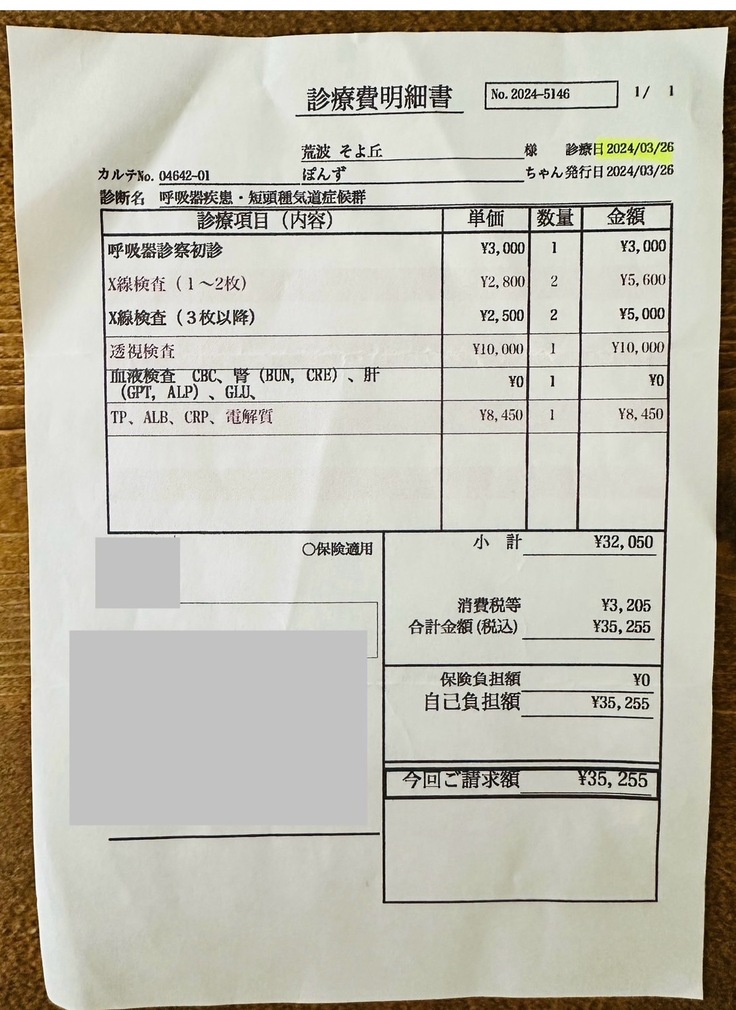 ・今回に手術前の診察代 35.255円-5.000円(ペット保険による補填)=30.255円