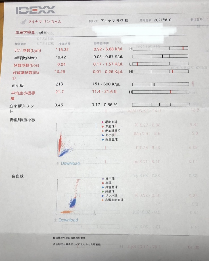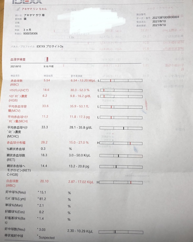 先生から、血液検査で異常がかなりあること、特に貧血の数値が危ないこと