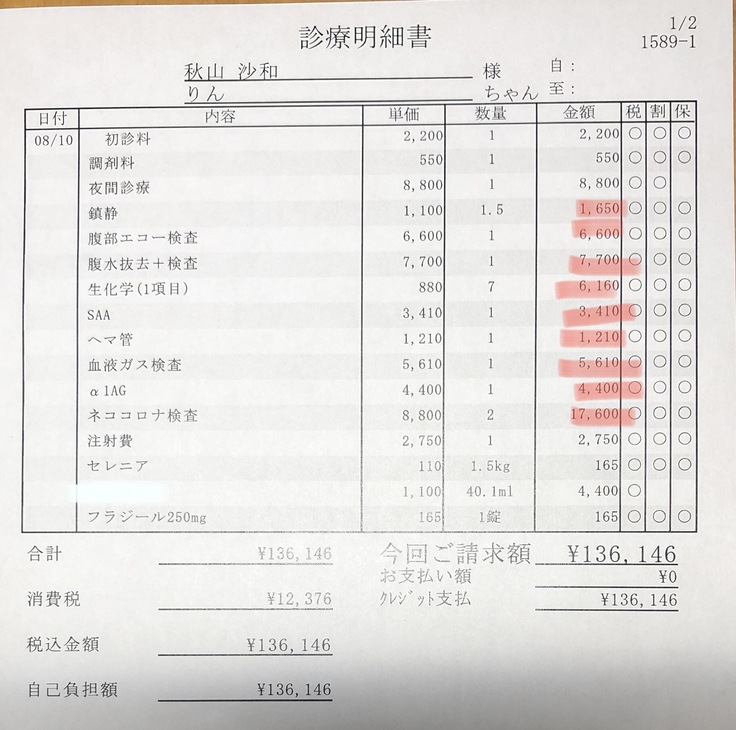 8月10日B病院検査代:54,340円(ネココロナ検査含む)