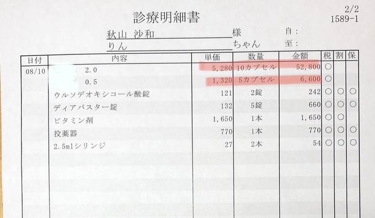 お薬代、検査費(少なくとも4回)で少なくとも800,000円はかかるだろうとの事でした。