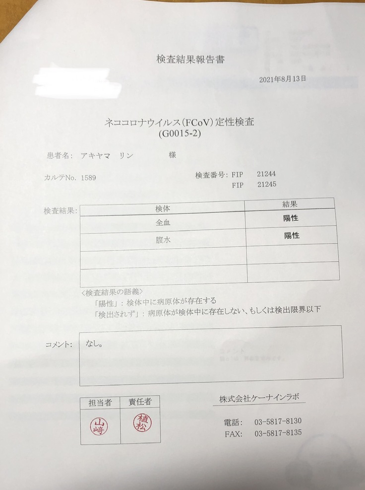 そして、やはりFIPの可能性が高いことを伝えられました。