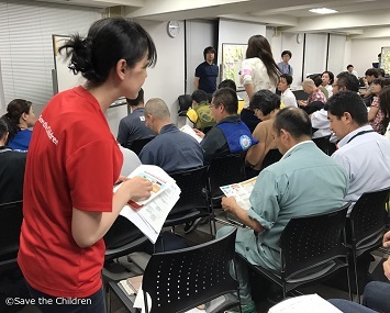 上記写真は、セーブ・ザ・チルドレンスタッフが支援関係者にパンフレットを配布している様子です。
