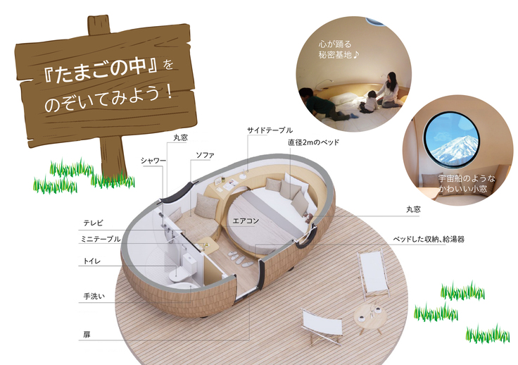 鳥取県のベンチャー企業・TOMONARI株式会社が、中国地方最高峰・伯耆大山の麓に位置するアウトドア体験施設「DAISEN RESORT 沢田ベース」に新たに建設する宿泊棟(1棟)の建設費の応援を募るプロジェクト。 このプロジェクトで建てる建物は、他の施設から独立した「たまご型ワンルーム」の宿泊棟1棟。その特徴的な形状から新たな伯耆町の目玉コンテンツとしてアピールし、大山圏域の地域活性化の一助になることが狙い。 本プロジェクトでは、集めた資金はすべて、この宿泊棟建設に用います。