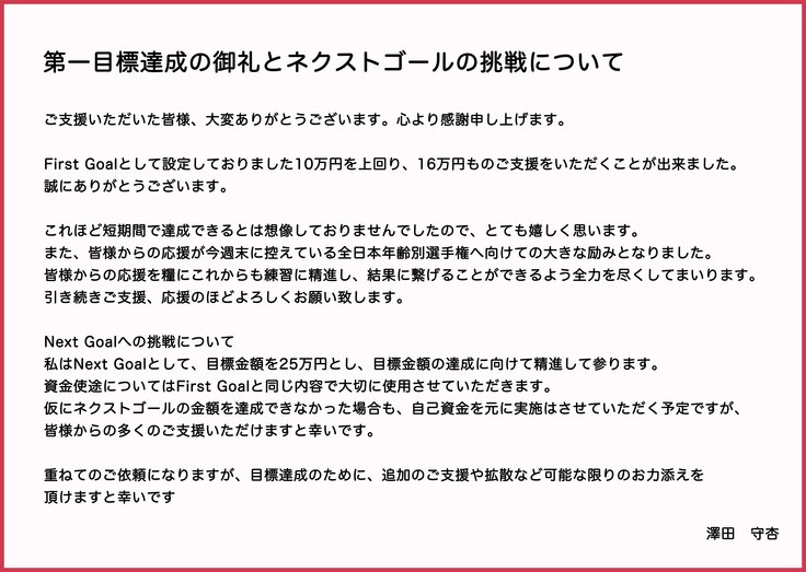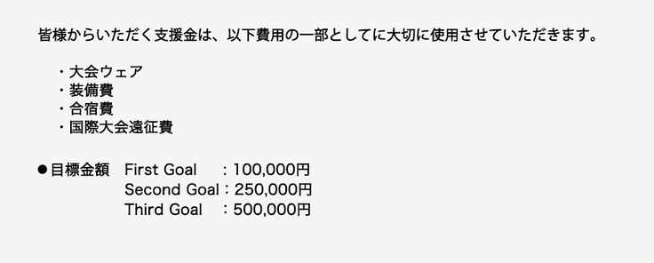 澤田守杏が、いただいたご支援金を大会ウェア・装備費・合宿費・国際大会遠征費の費用の一部として使用させていただきます。