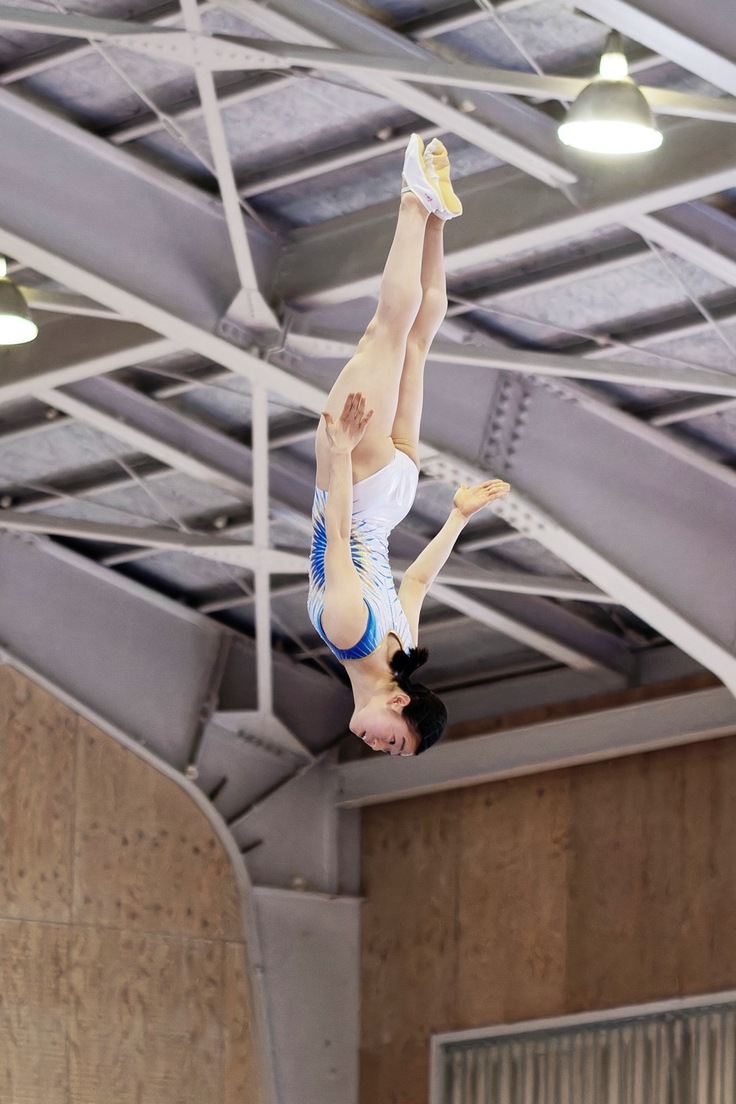 トランポリンは、10m以上の高さから宙を舞い、回転やひねりを駆使しながら、いかに美しく演技できるかを競うスポーツです。