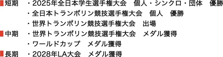 競技の普及と発展のためには、より多くの人にトランポリンの魅力を知ってもらうことが必要です。私は15年間トランポリン競技を続けてきた中で、競技の素晴らしさをもっと広めたいと思っています。