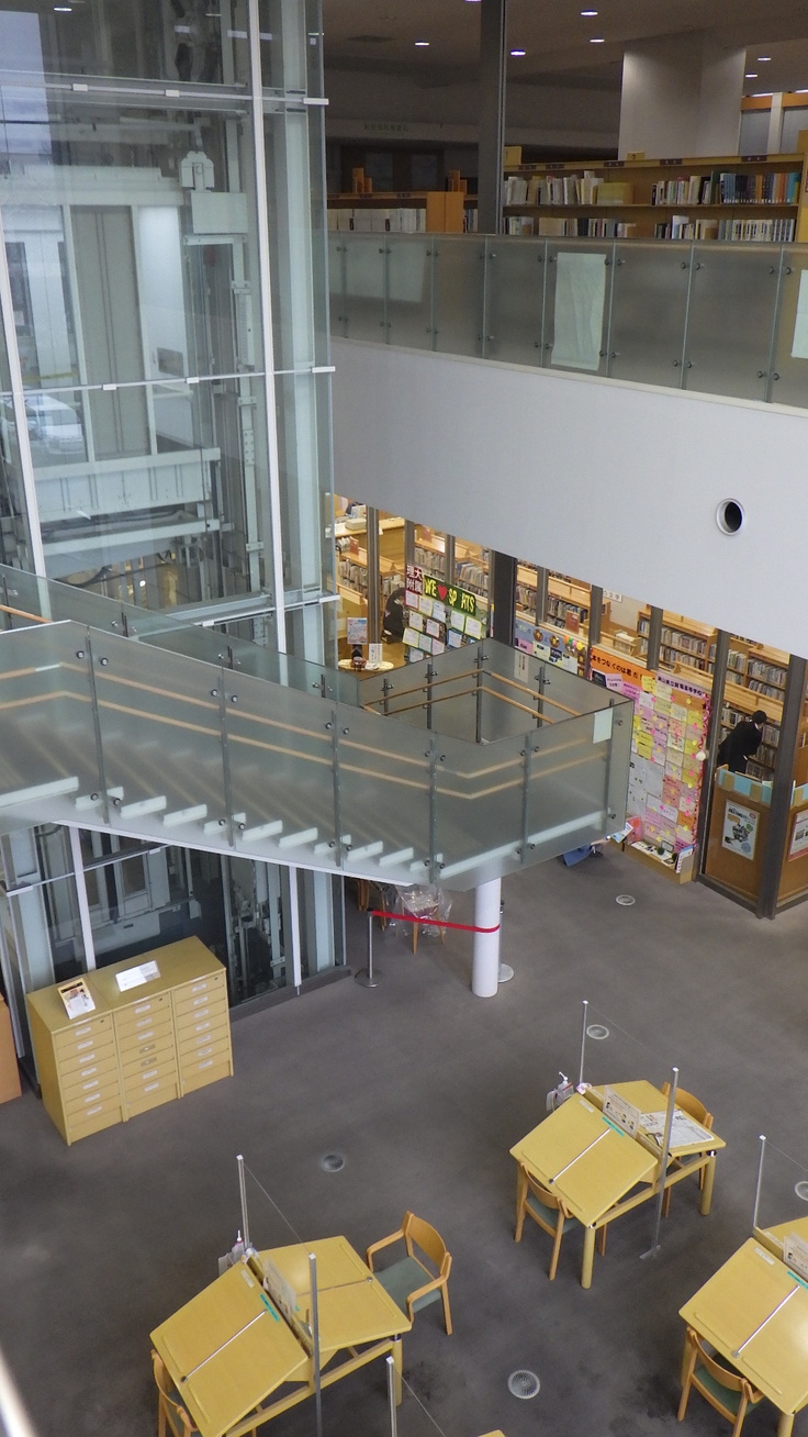 岡山県立図書館のこのあたりの空間がコンサート・ホールになりまーす。わくわく。
