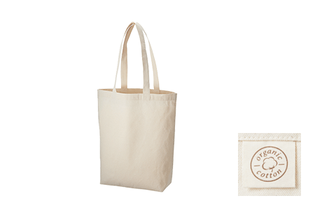 オーガニックコットンを使用した、薄手の4オンスコットンで作った底マチ付のエコバッグです。肩から余裕をもってかけることのできる長めの持ち手が特徴です。