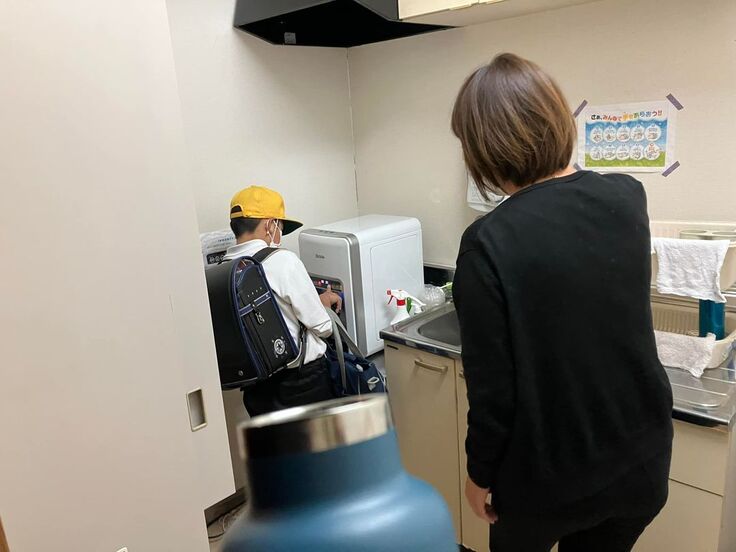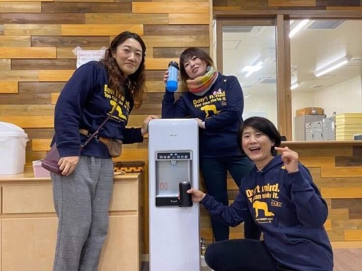 (ゴーフィールドにある給水機。学校帰りの社員のこどもたちも給水!)