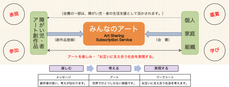 特別な才能がなくても、障がい児・者の方々誰もが参加できる。誰もがいつでも、どこでも作品を楽しみ、共に学び、成長できる。共生社会創造の担い手として参加できる。