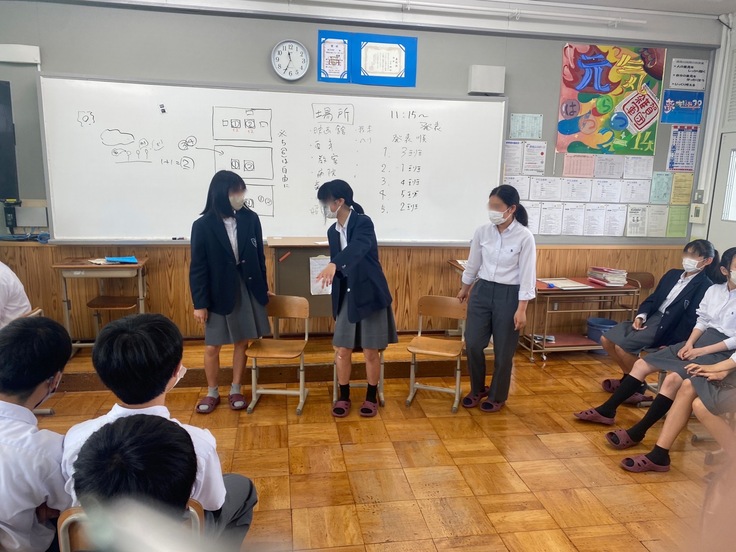 発表の時間には「満員のバス」「サウナ」「電車」「椅子を占領している集団」「椅子取りゲームをやる生徒」など、いろんなシチュエーションが登場しました。
