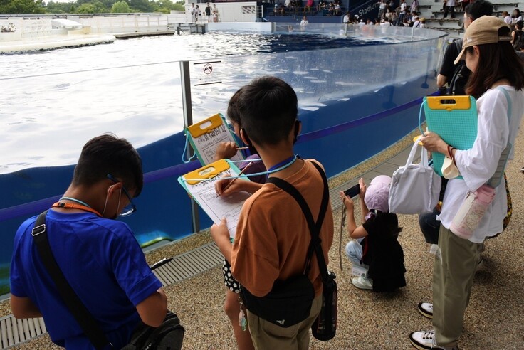さっき観たイルカを観察したり、それぞれのエリアの生き物を観て「何考えてるのかな〜?」「何でこんなことしてるんやろ?」など、想像を膨らませながらクイズを考えました。