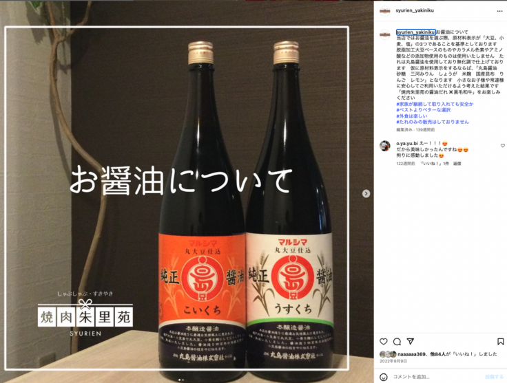 こちら、焼肉のタレ原材料へのこだわり、朱里苑さんのinstagram からスクショを使わせてもらいました。