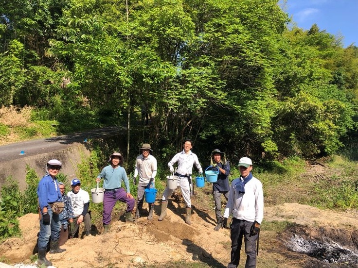 こちらは、竹炭をつくるときにがんばったバケツリレー。