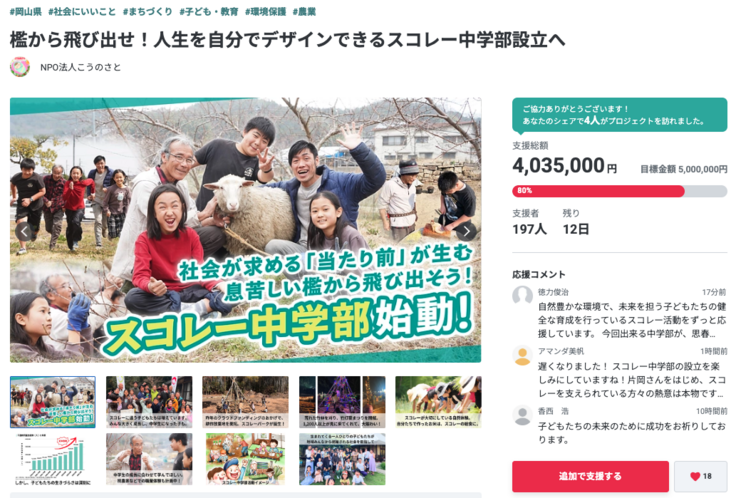 3月24日から始めたクラウドファンディング、たくさんの方のご支援、ご協力のおかげで80%まで達成することができました。