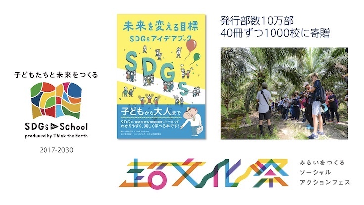 ほかにも映像、書籍、アプリ、イベント、ワークショップなど、多様なアプローチで、環境問題や社会問題など難しいテーマを、時に楽しく、時にほっとするような表現で伝え、自分ごととして考えてもらうことを目指して活動を続けています。現在は社会課題と向き合い、学び、行動を始めた生徒さん、先生を応援するSDGs for Schoolプロジェクトを中心に活動しています。具体的には、希望する学校への教材提供、全国の先生が集まり学びあうイベント「ティーチャーズ・ギャザリング」や、先生や生徒たちの想いから始まった「みらいをつくる超・文化祭」の開催、先生や生徒向けのスタディツアーなどを実施しています。
