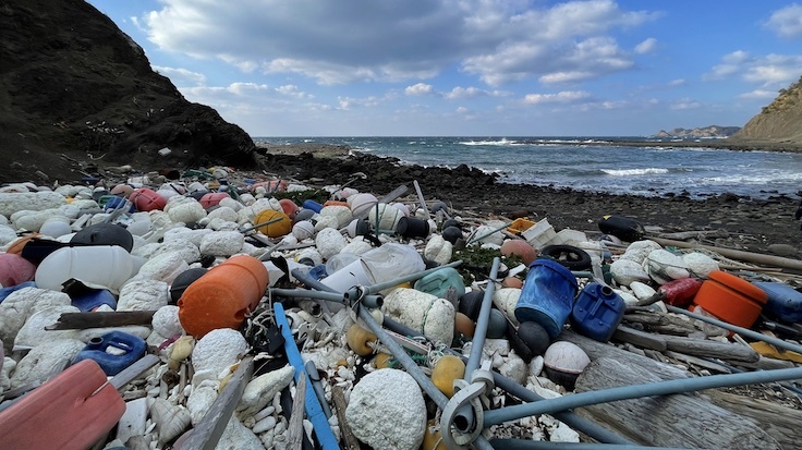 ここは、昔は地元の子どもたちの遊び場でもあったクジカ浜です。恐ろしいほどの量の漂着ゴミが海岸を覆い尽くしています。この光景には大きなショックを受けました。