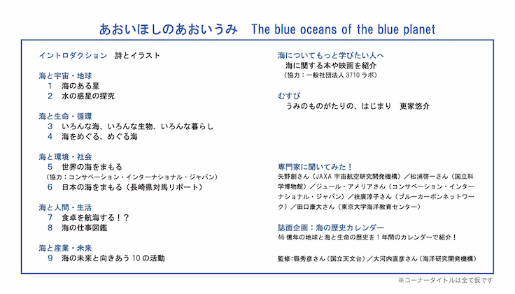 ビジュアルがメインの書籍ですが、要所要所に専門家の視点も入ります。JAXA宇宙航空研究開発機構の矢野創さん、国立科学博物館の松浦啓一さん、コンサベーション・インターナショナル・ジャパン代表のジュール・アメリアさん、ブルーカーボンネットワークを立ち上げた環境ジャーナリストの枝廣淳子さん、3710Lab代表で東京大学海洋教育センターの田口康大さん。宇宙や海洋について科学的な視点での監修には国立天文台の縣秀彦さん、海洋研究開発機構(JAMSTEC)の大河内直彦さんにお願いしました。総勢30名以上の方の力をあわせて本づくりをしています。