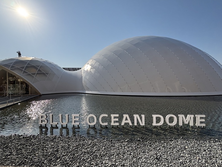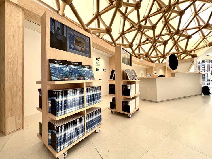 (ブルーオーシャン・ドームは、主催:NPO法人ZERI JAPAN、総合プロデューサー:原研哉さん、建築:坂茂さんによるパビリオンです。ドームAでは水の循環を表現したアートが、ドームBでは巨大な球体スクリーンに映し出される海の危機を表現した映像を見ることができます。本が販売されているドームCは様々な団体が発表を行うステージになっていて、構造材には紙管が使われています)