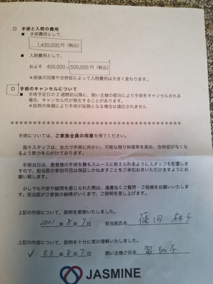 出来ればずっと診て頂いたJASMINEにお願いしたかったのですがお金を貯める時間もなく関東から名古屋へ行くリスクはありますが手術費用が出来ましたら名古屋の茶屋ヶ坂動物病院での手術を予定しております。
