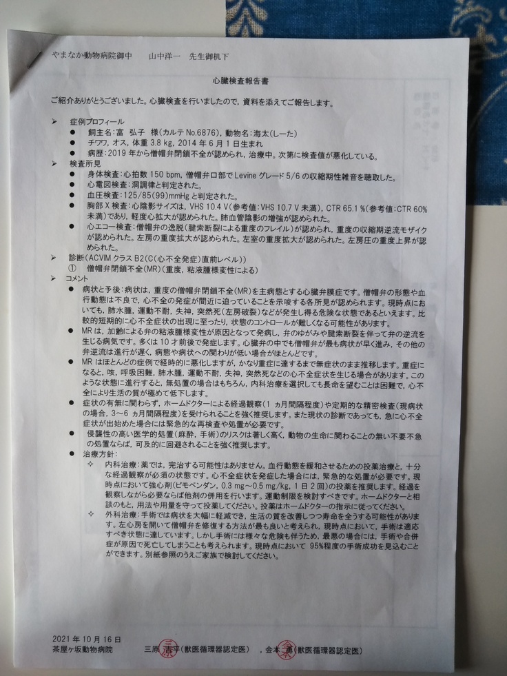 獣医師の話ではここから徐々に心臓が肥大し薬服用、薬も効かなくなり肺水腫を起こし肺水腫を起こしたら余命9カ月ほどだと話を受け、手術をすれば元通りに走り回ることが出来て犬生を全うできるとの事でした。