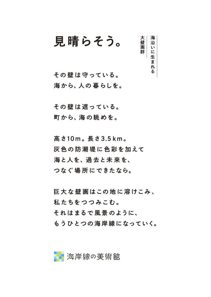 東北の美しい海岸線の風景。壁によって海の風景を見ることができなくなった海岸線に、地域住民や全国の方を巻き込みながら壁画をつくり、新しい風景を生み出すことで人と防潮堤との新たな関係性を築きます。