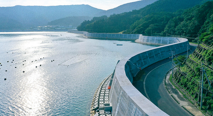 緑深い山々と青い海が作り出す、美しく豊かな漁村は 2011年3月11日の東日本大震災で20mの津波が襲い町の8割が壊滅しました。震災後、雄勝町の海岸線を囲うように高さ最大10m/全長約3.5kmの巨大防潮堤が建設されました。
