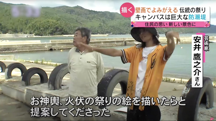 壁画はアーティストが一人で制作するだけでなく、そのプロセスに住民や外の人を巻き込むことでみんなでつくる美術館として運営しています。アーティストが雄勝町をリサーチし、地域住民と話しながら壁画のモチーフを決め、3.5kmある防潮堤の中から描くエリアを決め制作をしています。