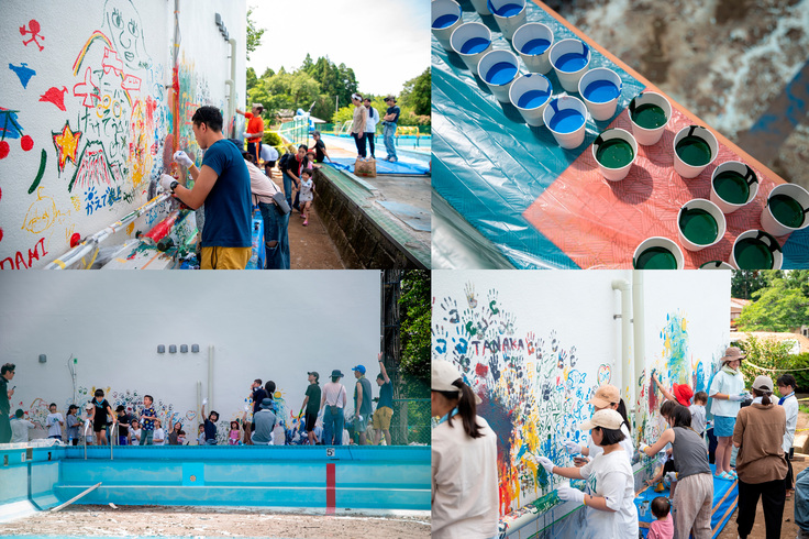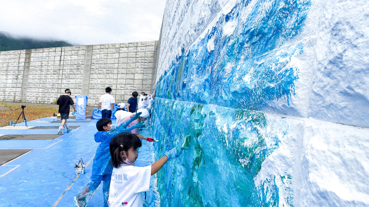 2024年には、海岸線の美術館初である、雄勝町外での壁画の制作も行いました。場所は石川県小松市波佐谷町にある廃校を利活用したコミュニティ施設の壁面。波佐谷町の地名の由来でもある蓮の池をモチーフに、住民との下塗りイベント「一筆一揆」などを行いながら、町のシンボルとなる壁画を制作。今後も、海岸線の美術館として日本の海岸線沿いの地域に地域の魅力をアーカイブする壁画をつくり続けていきます。
