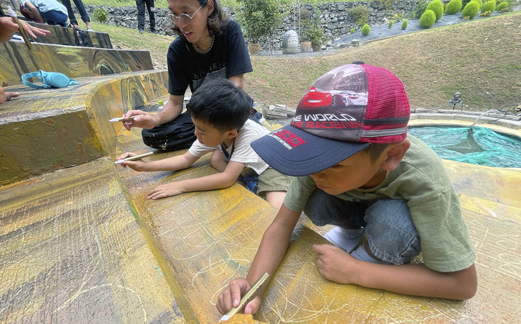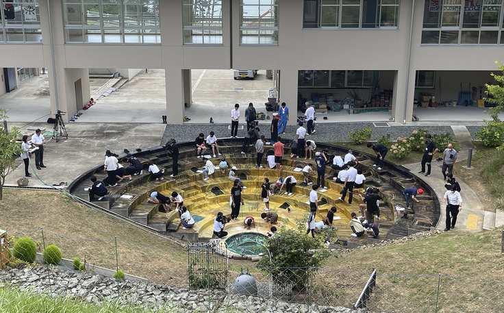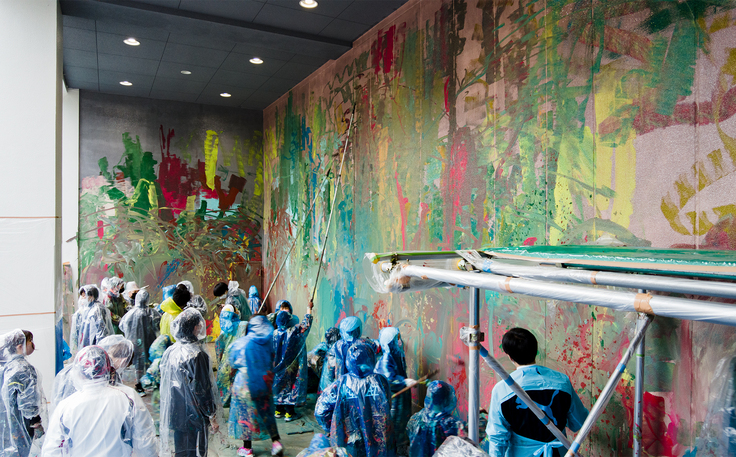 防潮堤での壁画制作だけでなく、地元の雄勝小中学校の生徒と毎年、校内に壁画・地上絵・インスタレーションなどを制作する授業やワークショップ「海岸線のこども美術館」を開催しています。