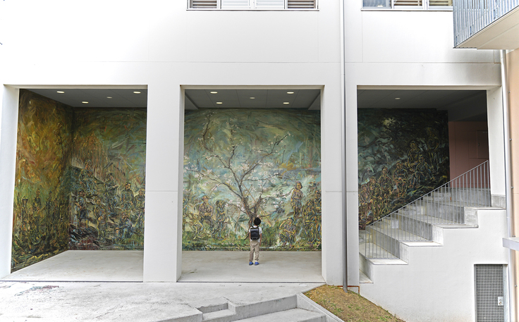 美術館の活動の根幹は、毎年アーティストによって制作される巨大な壁画作品。2024年現在、防潮堤に4作と雄勝小中学校に2作の計6作品を展示しています。描くモチーフは防潮堤によって見えなくなった美しい風景や生業、津波によって流されたり、震災後人が減って失われかけているお祭りなどの文化・風習を描きながら、新しい日常の風景の一部としてこの地にあり続けられるものを描いています。